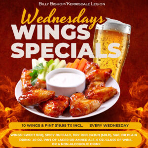 In addition to the regular menu, every Wednesday visitors to the Branch can now order 10 wings (chose from sweet bbq, spicy buffalo, cajun dry rub (mild), salt & pepper, or plain) and either a pint of lager or amber ale, or a 6 oz glass of wine, or a non-alcohol drink for $19.95 taxes included.