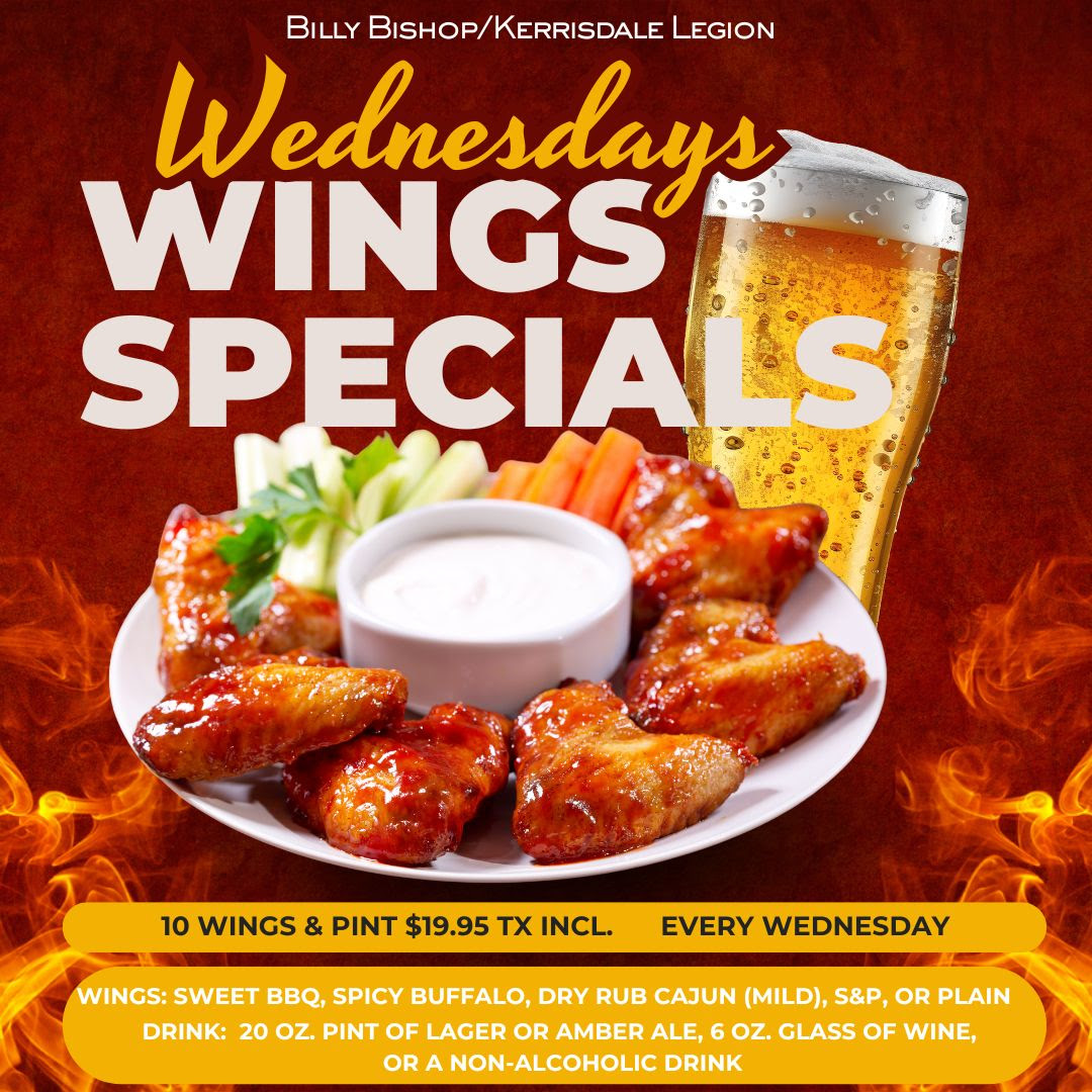 Members, guests and neighbours are invited to the Branch’s Holiday Brunch on Saturday December 13th. We’re serving eggs, sausage, ham, smoked salmon, breakfast potatoes, baked beans, fresh veg, fruit and cheese, fresh pastries, and oatmeal. Coffee and tea are also included. Cost is $24.95 per person, taxes included. Please RSVP via email to BillyBishopLegion@gmail.com to secure your place!